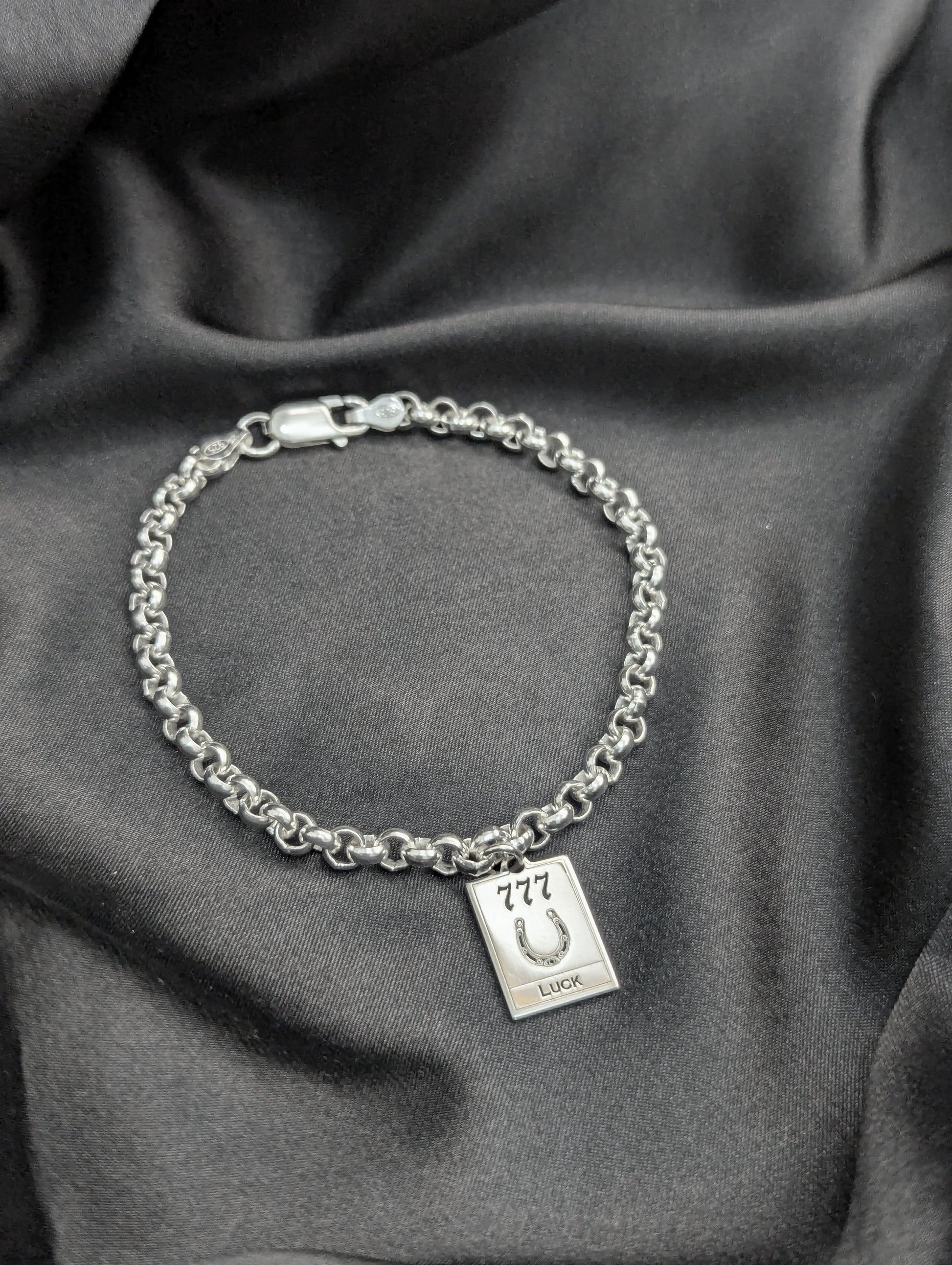 Discover your charm with this playful 'Lucky' Angel Number Belcher Bracelet, handmade from Sterling Silver. Featuring a delicately engraved 777 angel number charm, it’s your perfect little talisman for luck and positive vibes wherever you go. Add a sprinkle of magic and style to your everyday look!