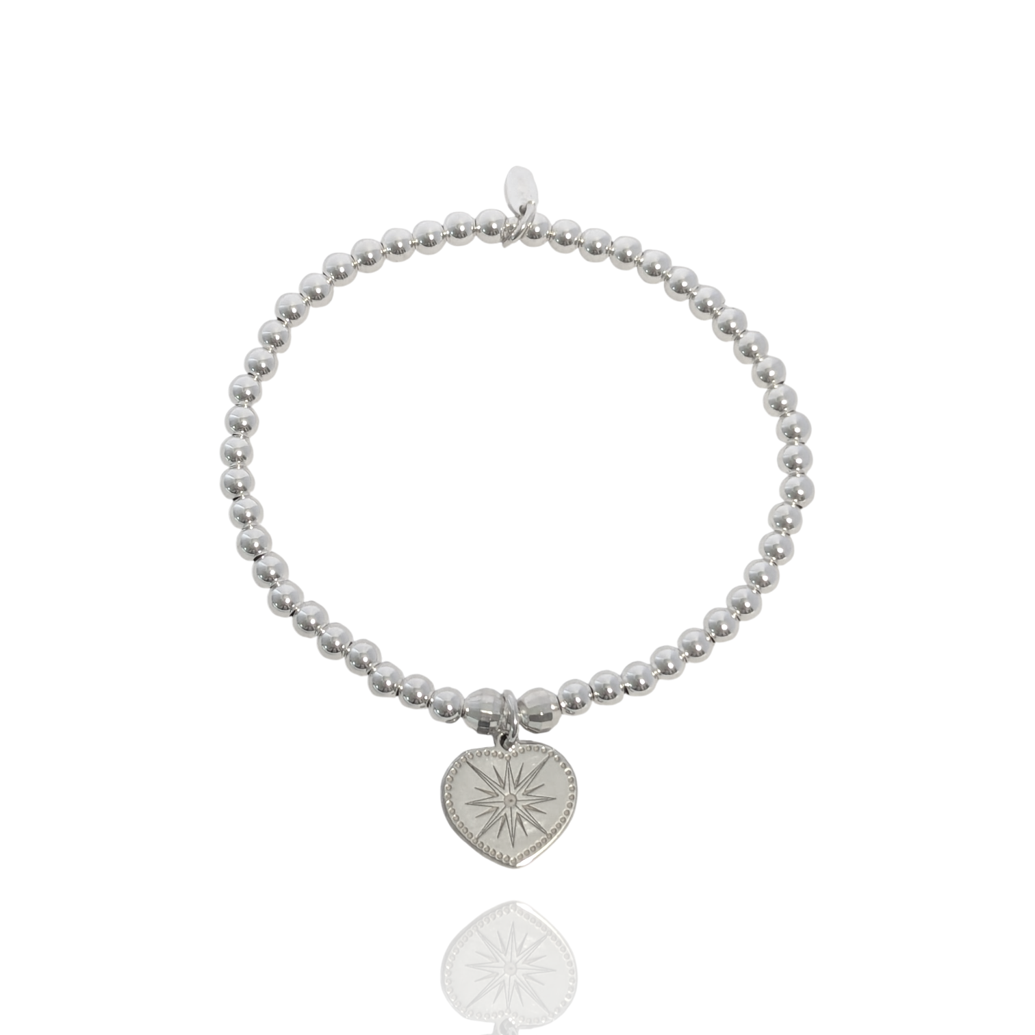 Add a touch of celestial elegance to your jewellery collection with our Starburst Bracelet. This Bracelet shines with a mirror finish and features a heart charm etched with a captivating starburst design, hand designed by our founder Karen. Elevate any outfit with this luxurious accessory.