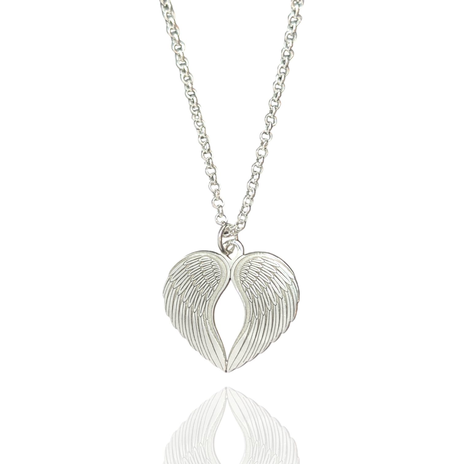 This exquisite Angel Love Necklace boasts a heavy silver polished angel wing charm with a mirror finish. A symbol of grace and protection, this necklace is a true gem for any discerning individual looking to add a touch of elegance to their wardrobe.