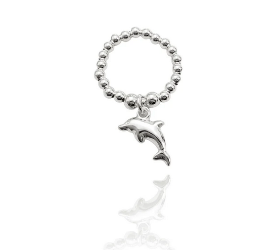 Intelligent and majestic, many believe dolphins have special healing powers, and we celebrate their beauty with this shiny silver charm on our stretchy silver bead ring.