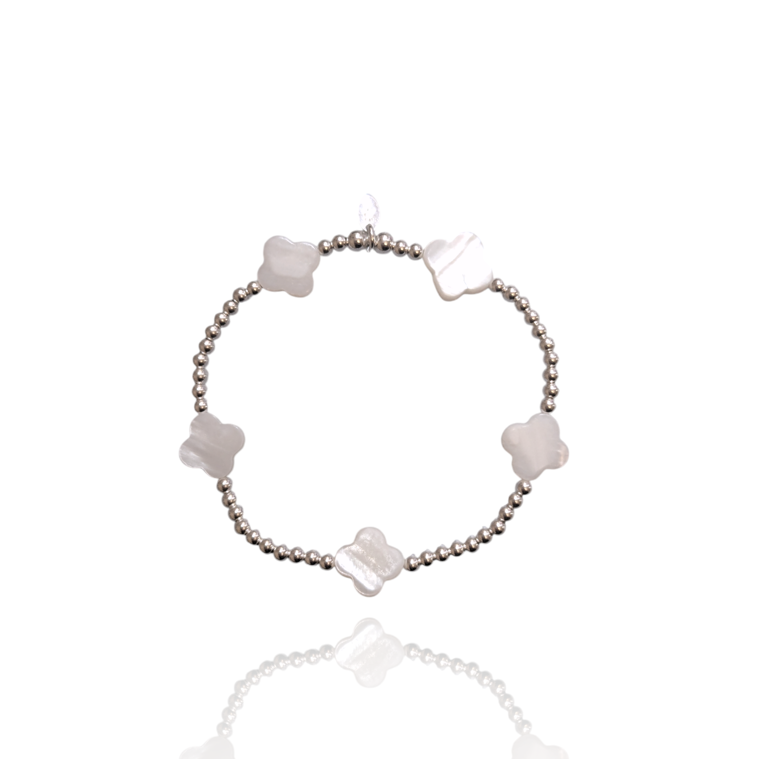 Introducing our Clover Mother of Pearl Bracelet. Handmade with our beautiful pearl clover motif with shiny sterling silver beads on stretchy thread this bracelet is a perfevt addition to your jewellery collection