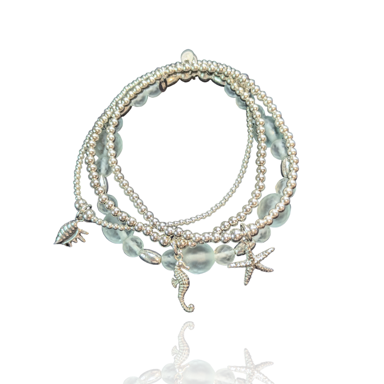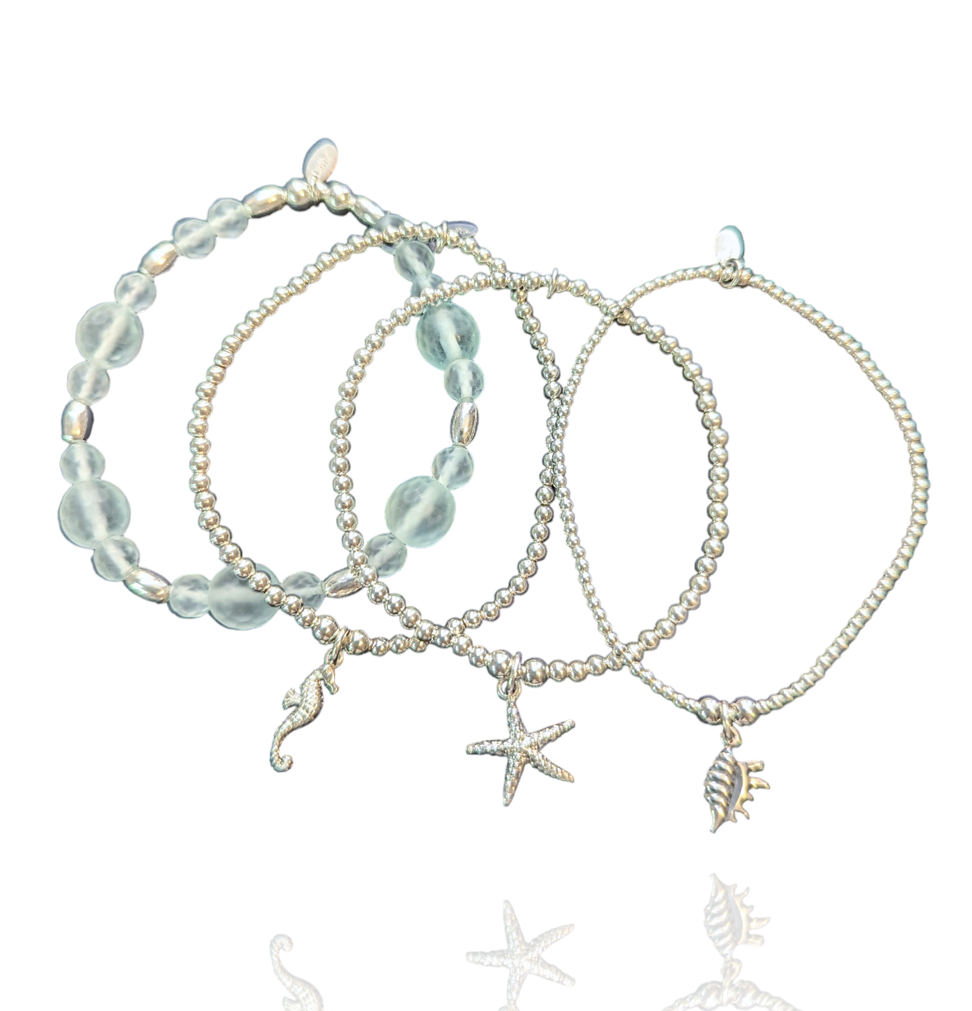 Get ready to ride the waves with our Ocean Seaglass Stack! This Stack is made from 4 sea themed bracelets; the Mini Bead Conch Shell, Seaglass Treasure, Seahorse and Starfish bracelets. Create the perfect accessory for any beach lover and dive into style with these unique playful pieces!