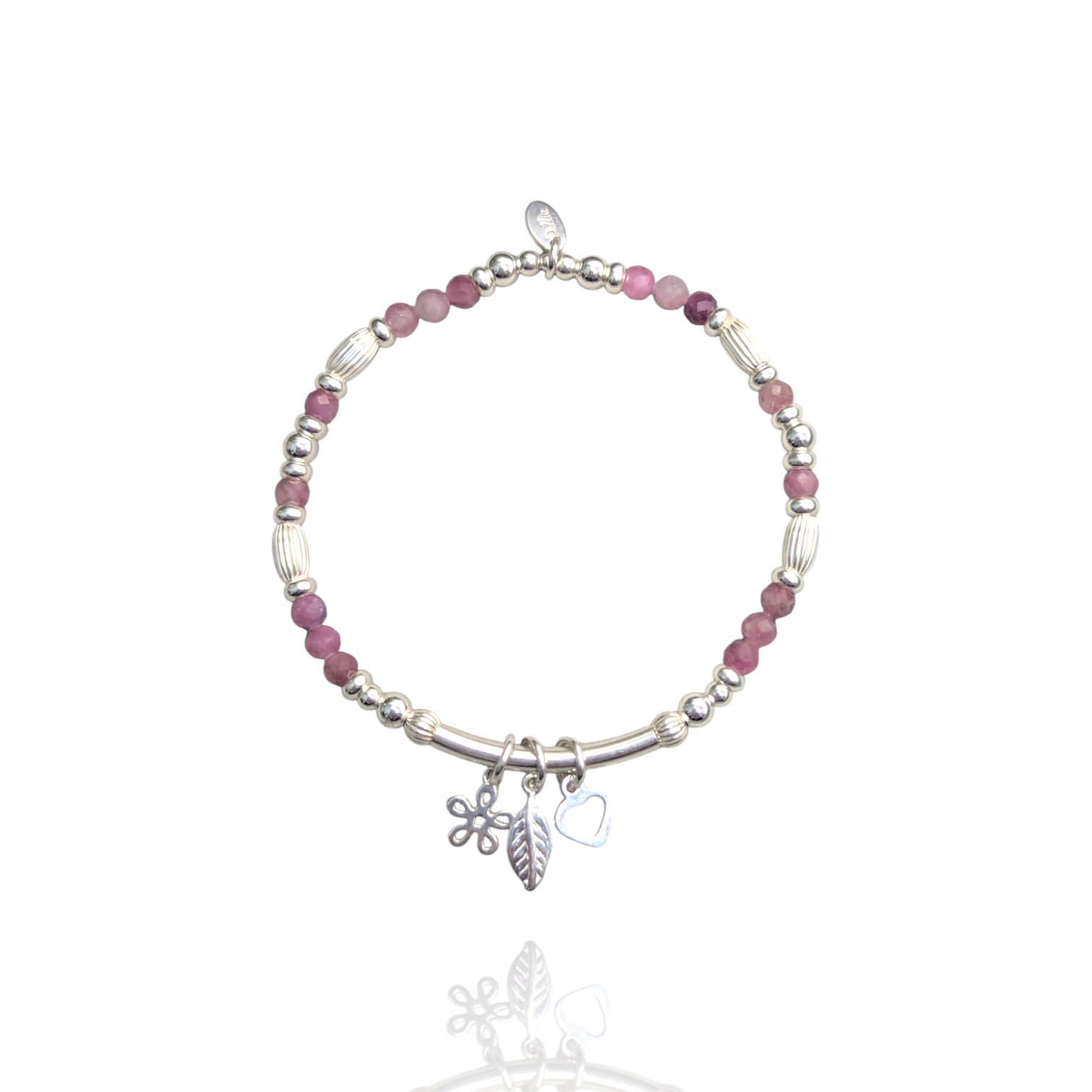 Add a pop of pink and silver to your outfit with the Pink Martini Bracelet! This eye-catching piece features three beautiful charms: Annabelle Open Heart, Leaf and Flower. Perfect for adding a touch of elegance to any special occasion.