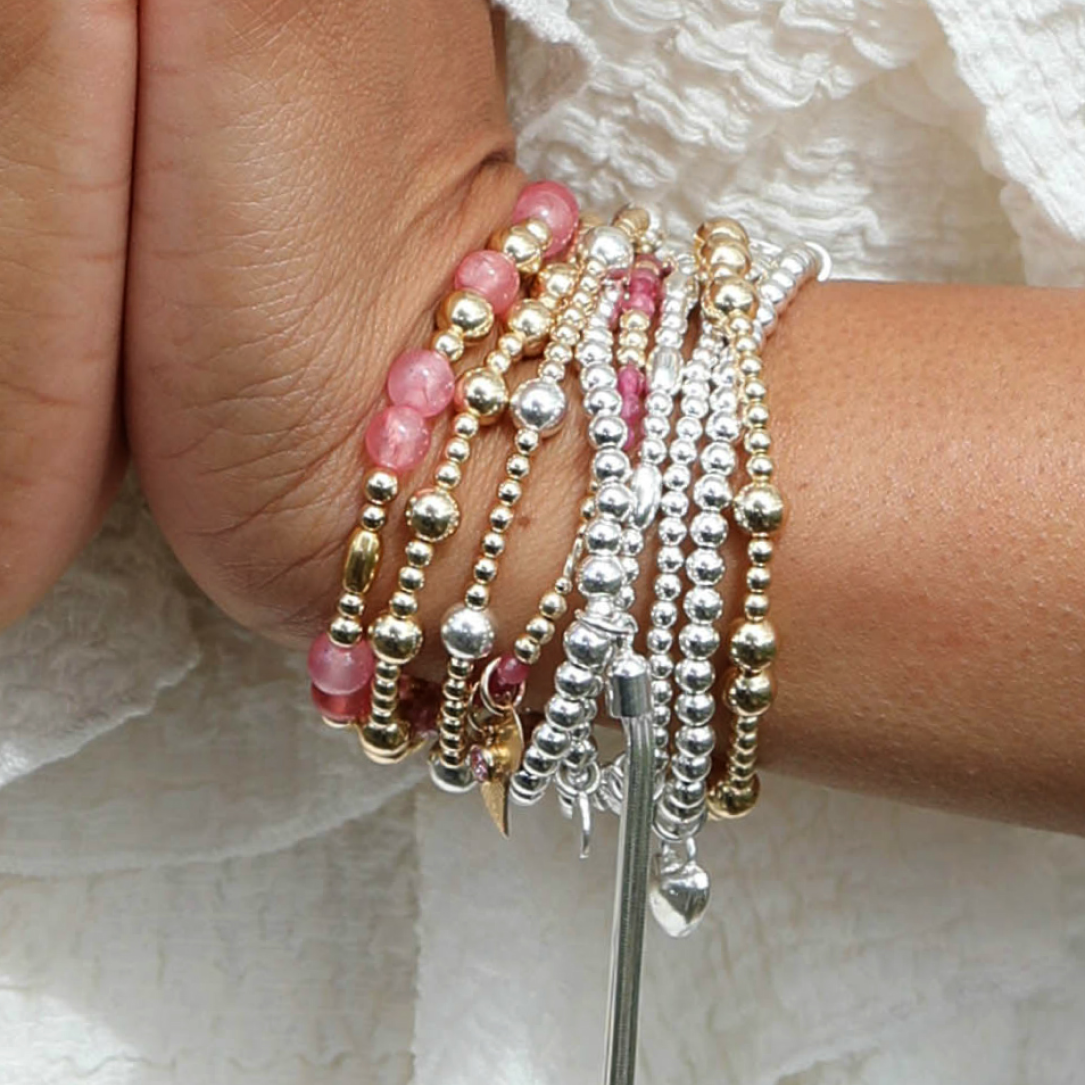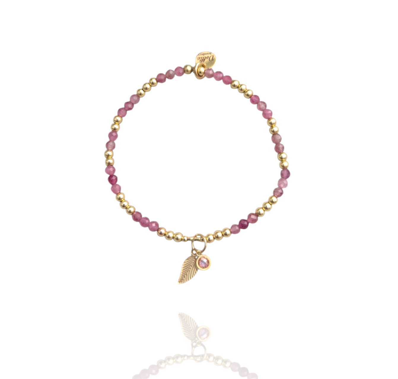 Add a pop of pink to your jewellery collection with the Sunset and Roses Bracelet. This unique piece features a mixture of gold fill and tourmaline, adding a touch of sparkle and beauty with its godl fill leaf and pink Cz charm. Elevate your style with this fun and playful accessory!